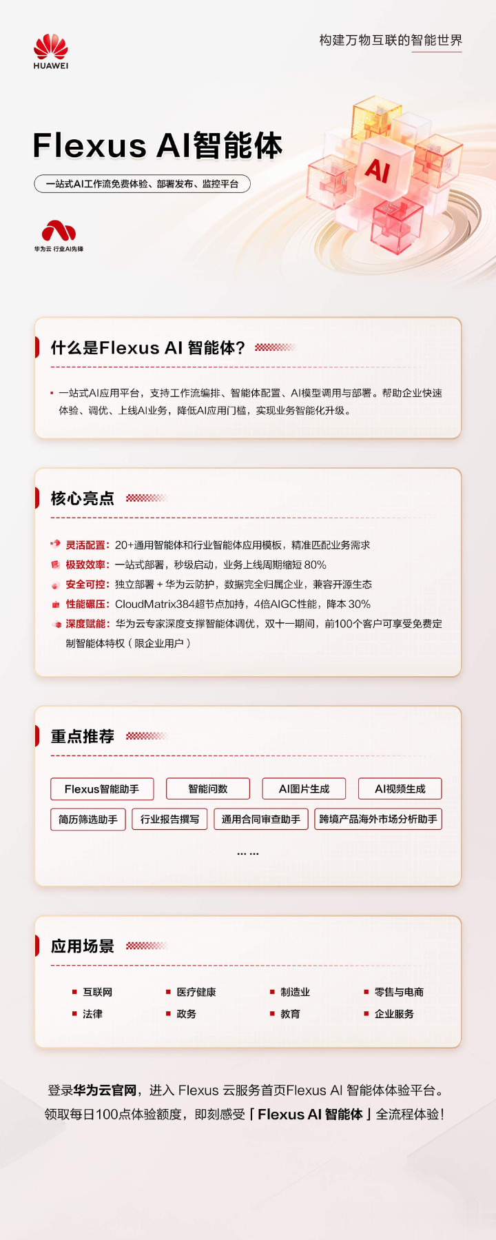 华为云 Flexus AI 智能体内置20多个此类场景模板,覆盖法律、营销、人力、金融、制造等高频刚需,真正把“专业能力”封装成“即点即用”的服务。